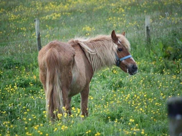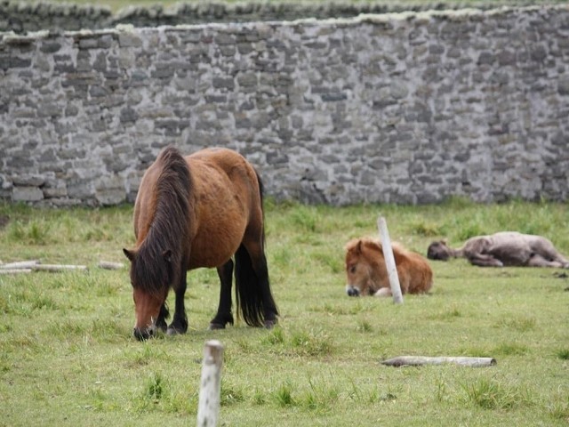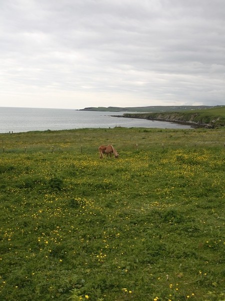 Erster Stop war der kleine Ort Hoswick mit seinem Visitor Center. Dort gab es eine Kostprobe vom leckeren Shortbread, einem typisch schottischen Gebäck. Das Visitor Center ist in einer ehemaligen Weberei untergebracht. Einige Maschinen und Geräte sind dort ausgestellt. Und auf der Weide nebenan.... unser erstes Shetlandpony. So recht Modell stehen wollte es aber nicht, doch für einen Schnappschuss hat's gereicht.
