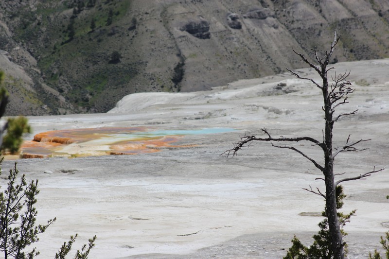 Am Nationalpark angekommen, haben wir erstmal unsere Permit für 30 $ gekauft. Durch Mammoth Hot Springs sind wir nur durchgefahren, zu voll. Kurz darauf der erste Stop an den Upper Terraces, wunderschöne Kalkterassen. Weiter Richtung Süden mussten wir durch die einzige größere Baustelle, die der Park zur Zeit hat, das hat etwas Zeit gekostet. Mit einigen Fotostops sind wir dann gegen 17 Uhr an der Lodge gewesen. Wir haben eine Cabin direkt am Geysir bekommen, ein traumhafter Ausblick